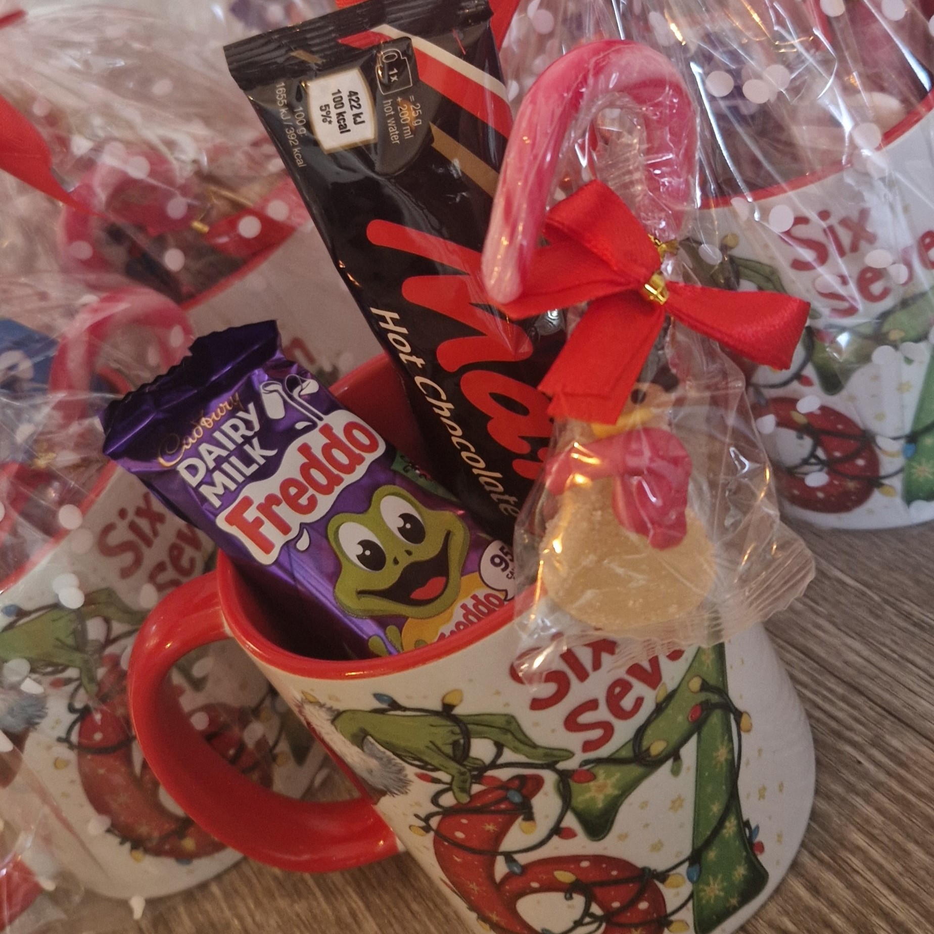 Cellophaned with Christmas Chocs, Candy Cane and Hot Choc sachet ready to gift.